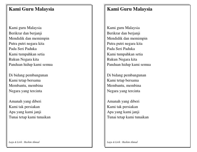 1986 Pendidikan Teras Nasionalisme. Lagu Guru Malaysia Kami guru Malaysia Berikrar dan berjanji Mendidik dan memimpin Putra putri negara kita Pada Seri Paduka Kami. 15 Lirik Chord Kunci Gitar Melayu Bukannya Aku Tak Cinta Iklim.